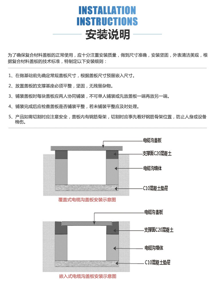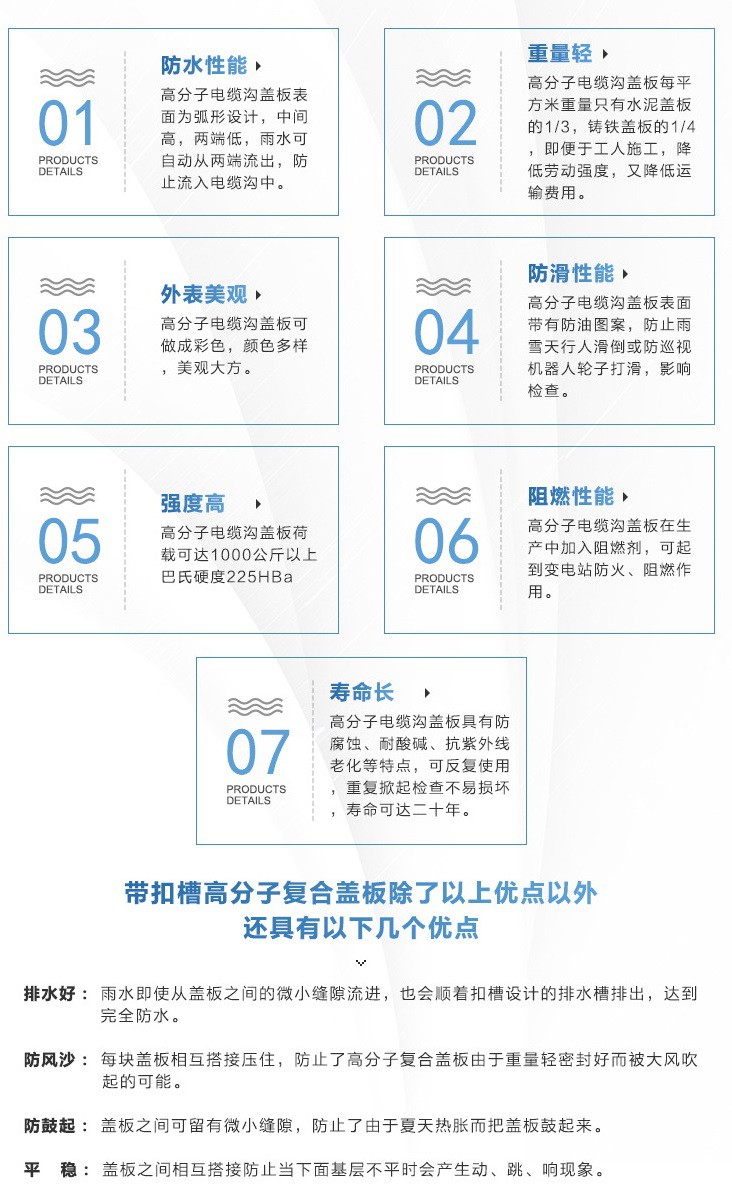 由于該產(chǎn)品是經(jīng)高溫模壓成型,蓋座合縫間隙較小,克服了鑄鐵,水泥類電纜溝蓋板“跑、跳、響”等問題,廣泛應(yīng)用于新建廠房,配電房的的電纜溝蓋板。