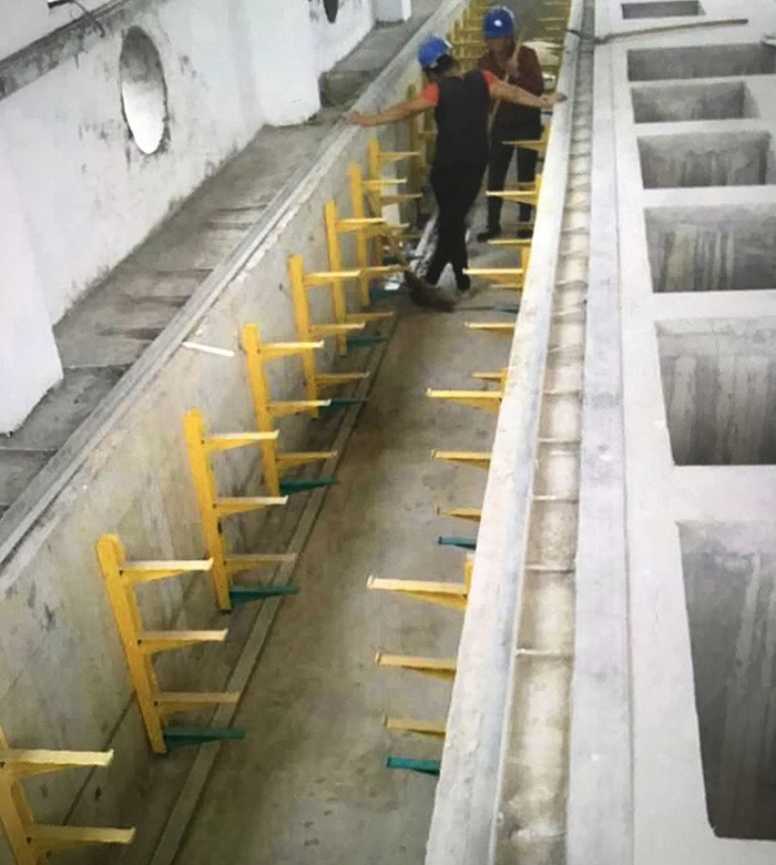 5.支架預(yù)埋時(shí)須保證支架基座與砌墻混凝土充分咬合、密實(shí)、與固定墻面保持直角狀態(tài),保證底座受力面積,避免扭曲。鋪設(shè)電纜時(shí),宜采用自上而下鋪設(shè),拖動(dòng)電纜時(shí)宜水平拖動(dòng)。